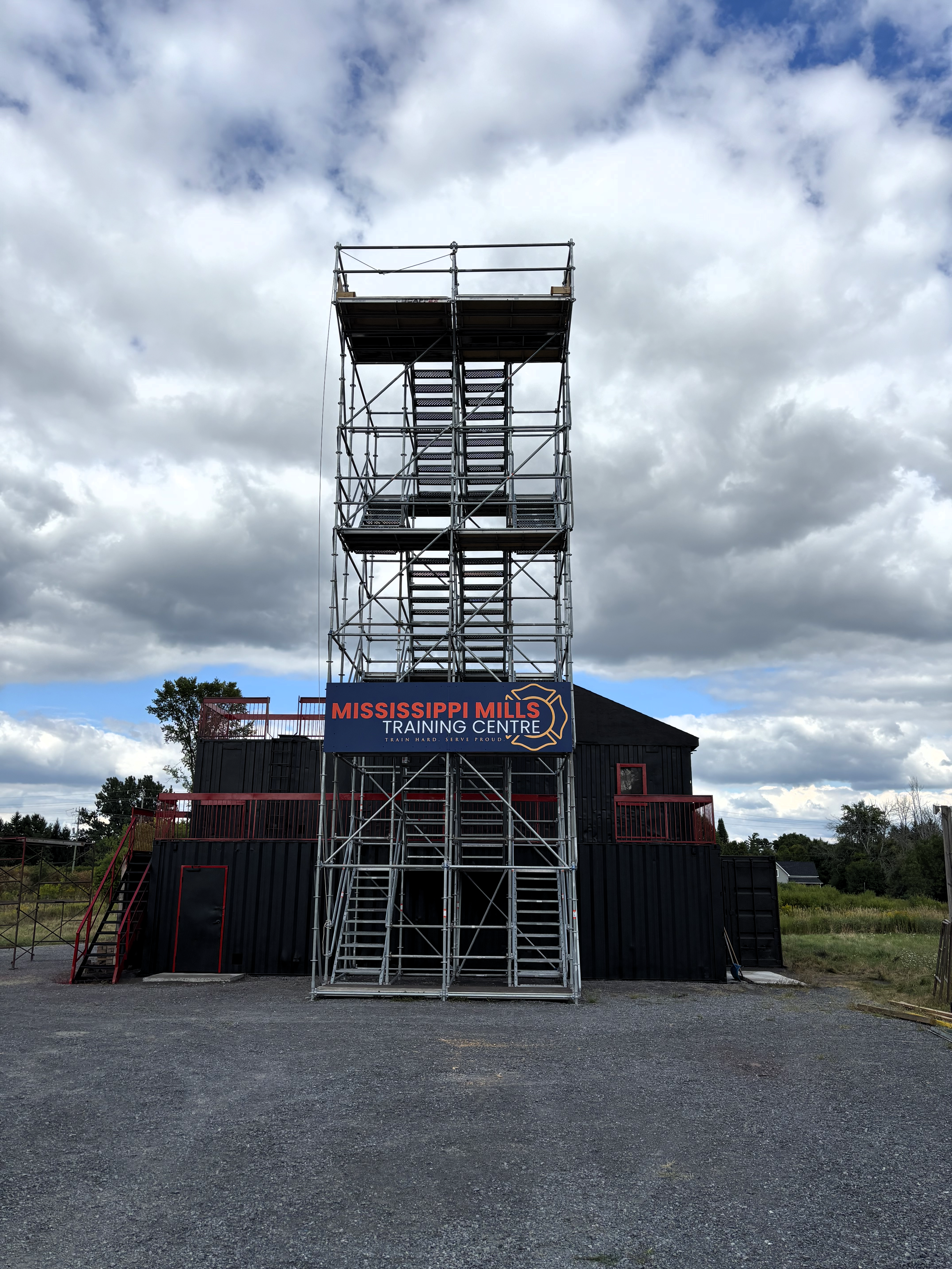 An engineered multi-level fire tower that can be used for drills or training, including competitions.