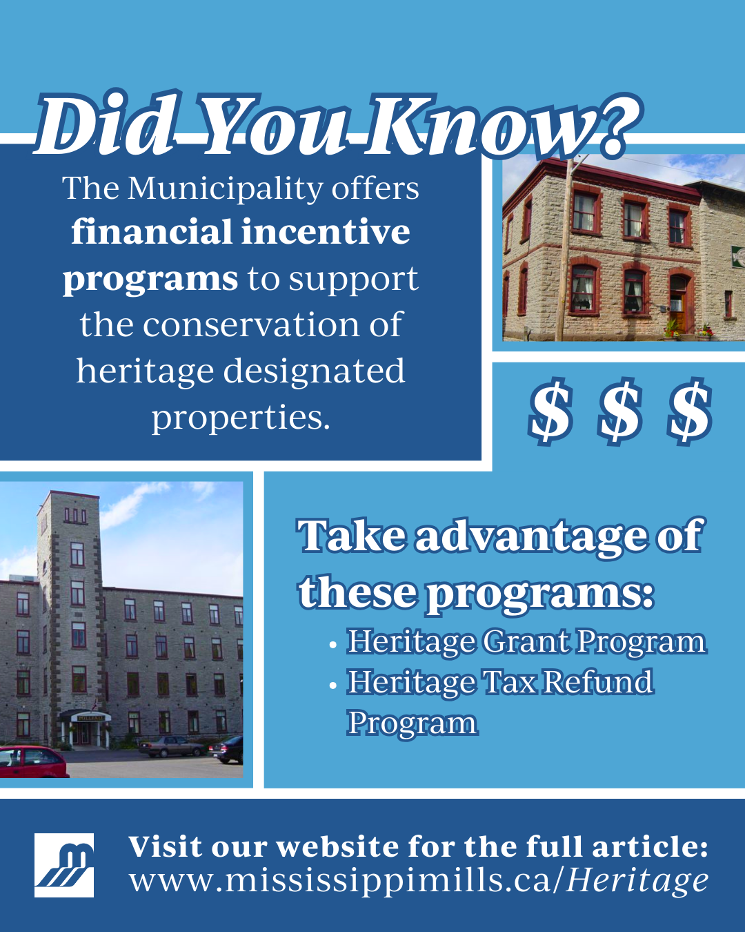 Learn more about eligibility, application requirements, and program details, on the Municipality’s Heritage page.