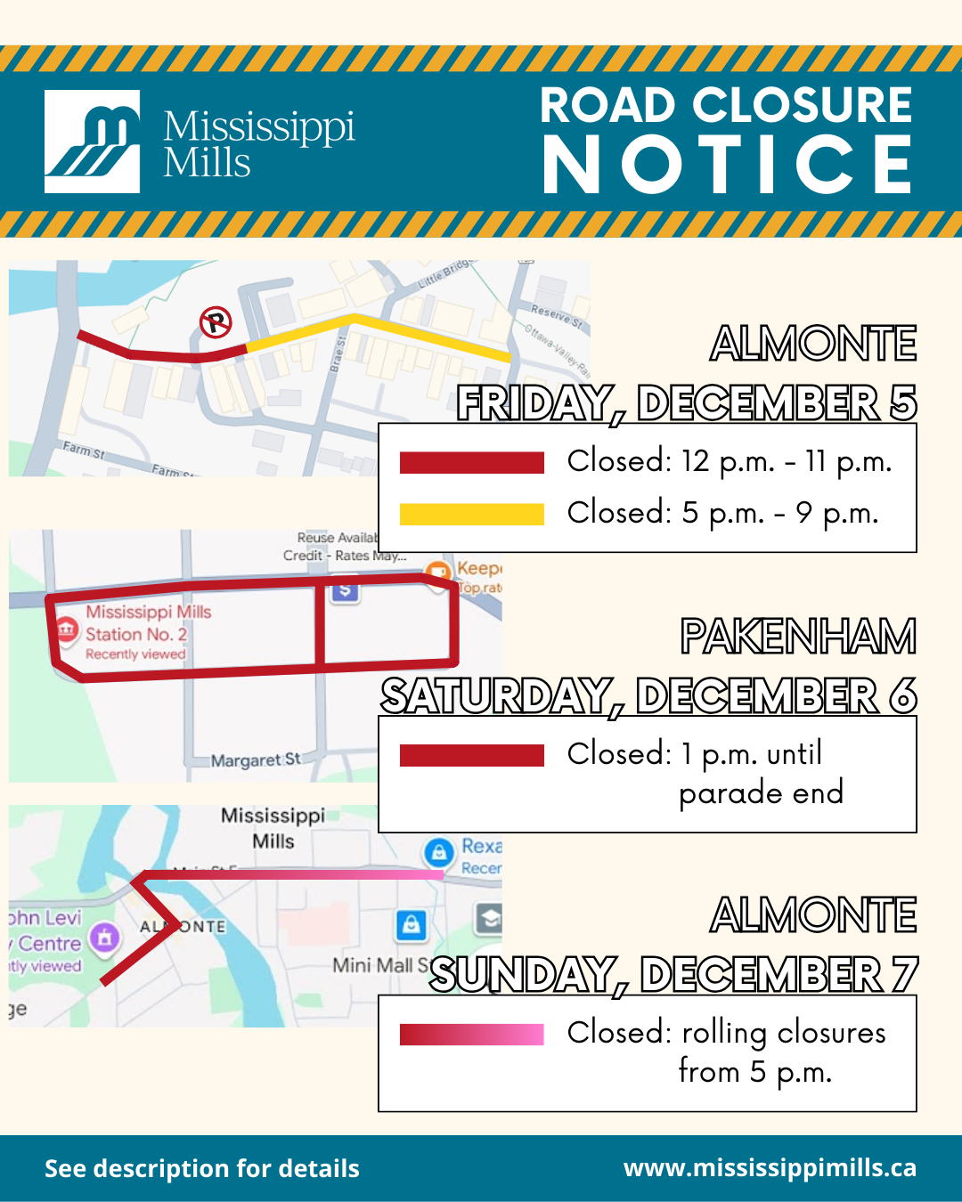 As we prepare for a festive weekend filled with holiday celebrations, please be advised of the following road closures. Residents and travellers should expect traffic disruptions and plan accordingly.